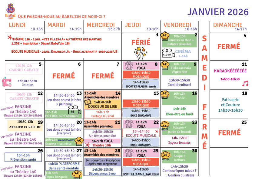 Studio Babel (création multimédia), ateliers artistiques et créatifs, atelier de cuisine, sorties culturelles et sportives, ciné-club… Il y en a pour tous les goûts. Babel’zin ayant pour vocation d’être un « lieu des possibles », chacun y exprime ses envies. Le programme des activités évolue selon les propositions des participants.